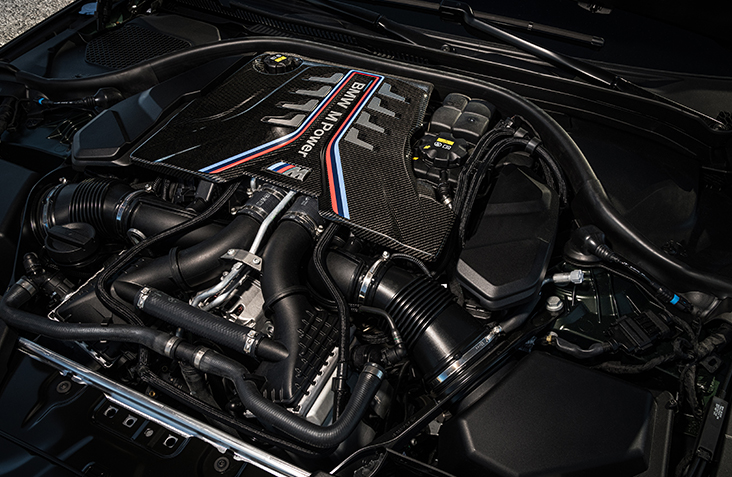 El BMW M TwinPower Turbo V-8 de 4.4 litros, capaz de generar hasta 617 caballos de fuerza con el paquete Competition, incluye un sistema de enfriamiento avanzado y un diseño de cárter de aceite único para mantener la presión en las curvas desafiantes.