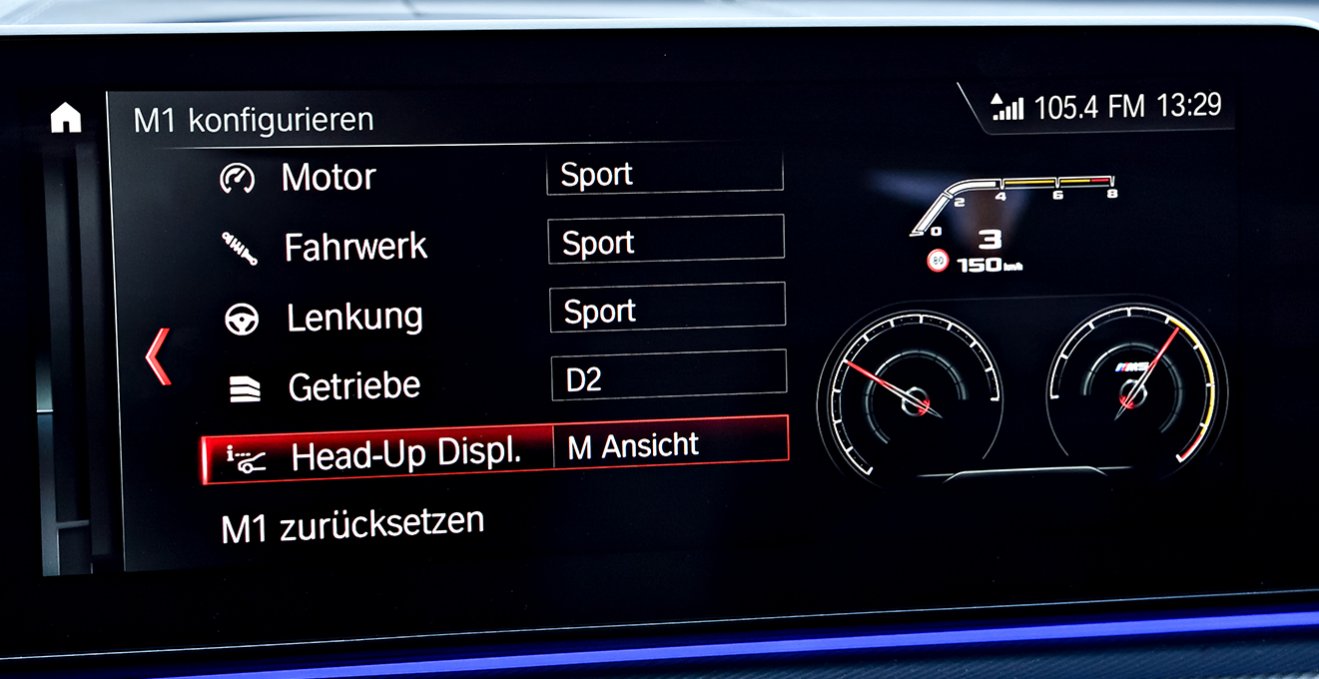El Head-up Display M le brinda tiempo de pantalla de desempeño al proyectar información importante de manejo, como puntos de cambio, cuentarrevoluciones y más, directamente en su línea de visión.